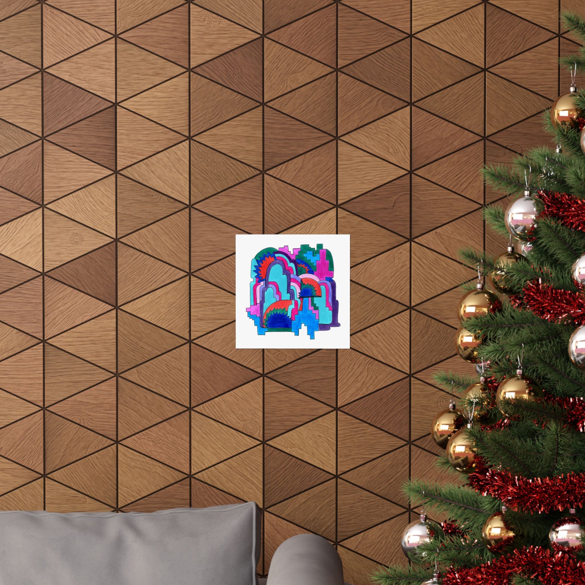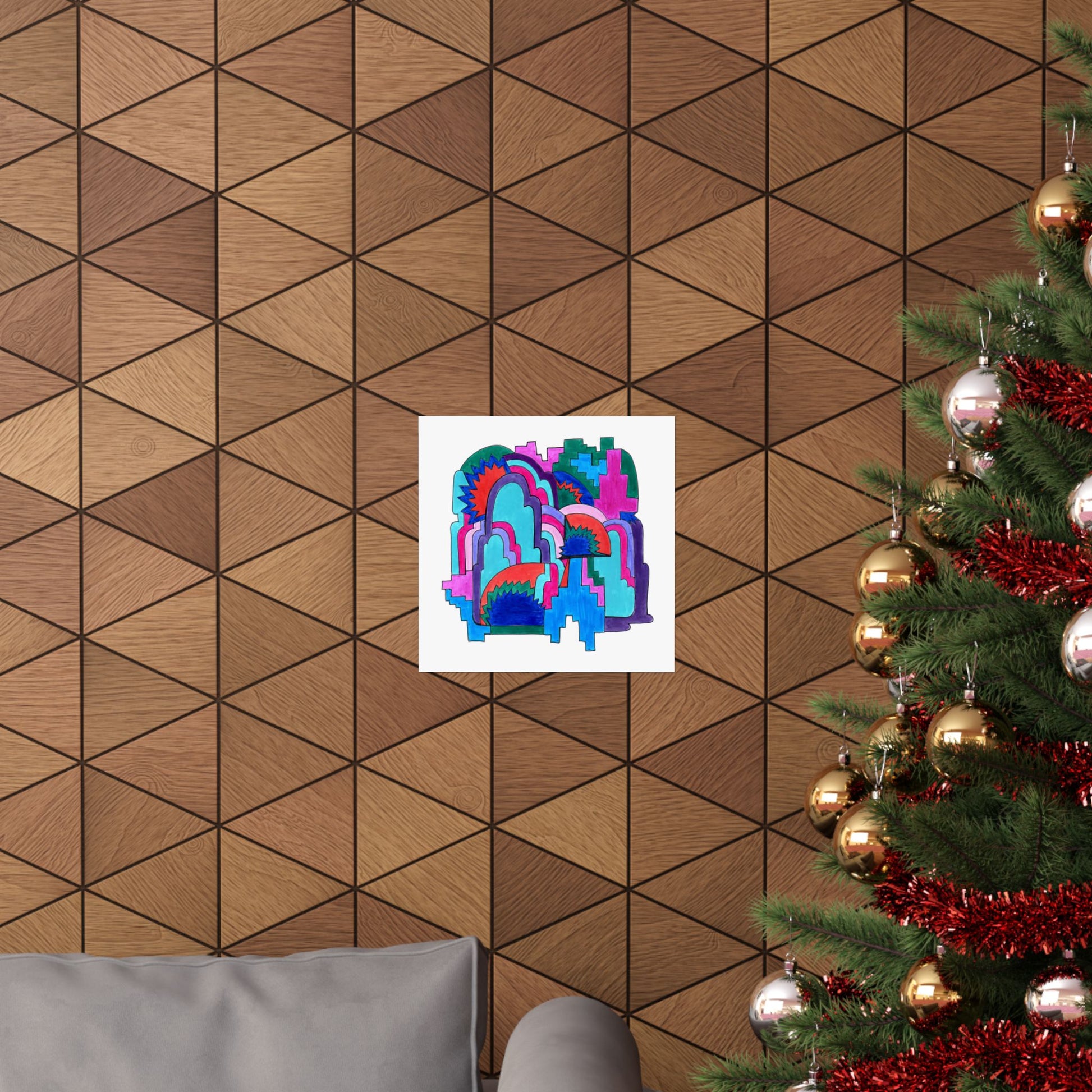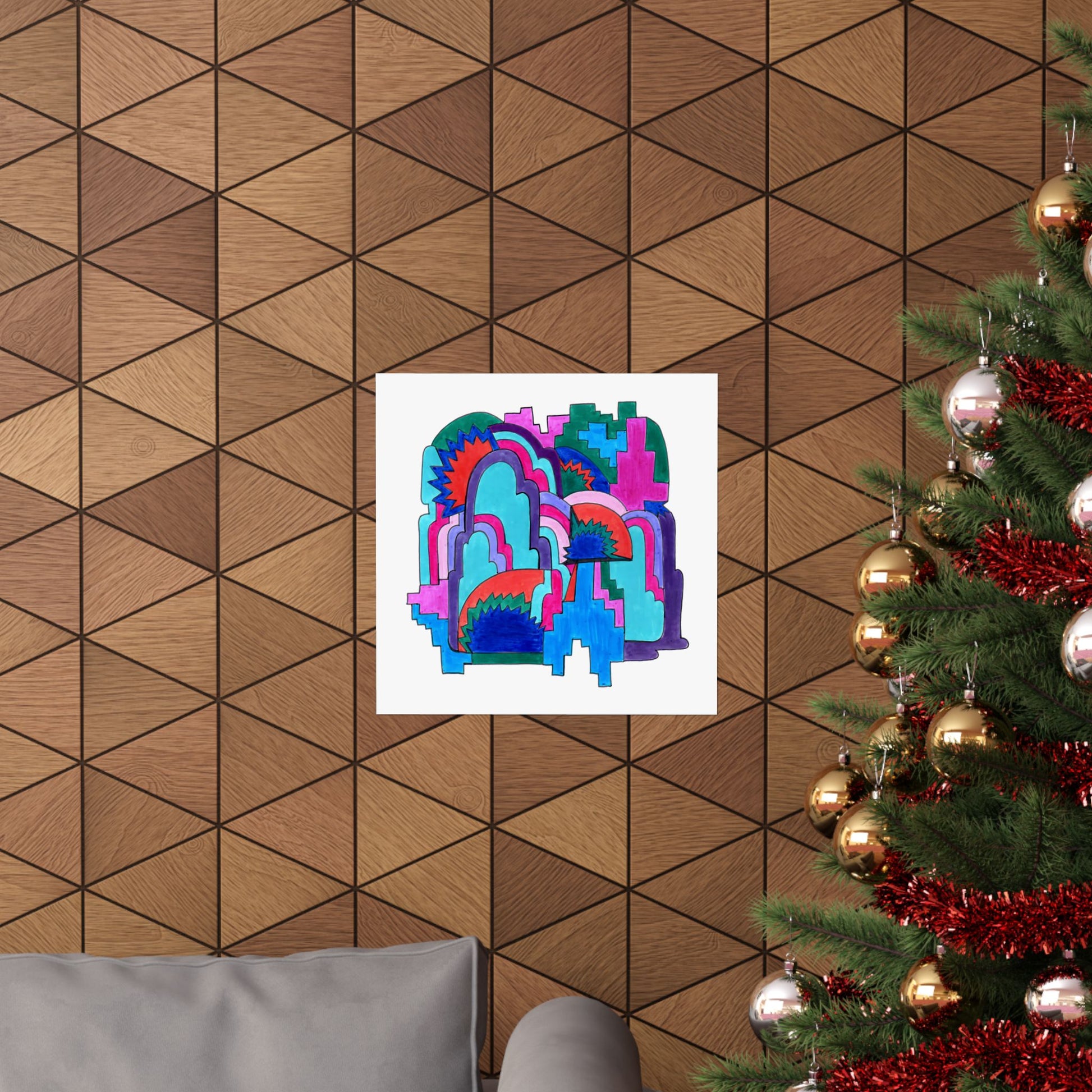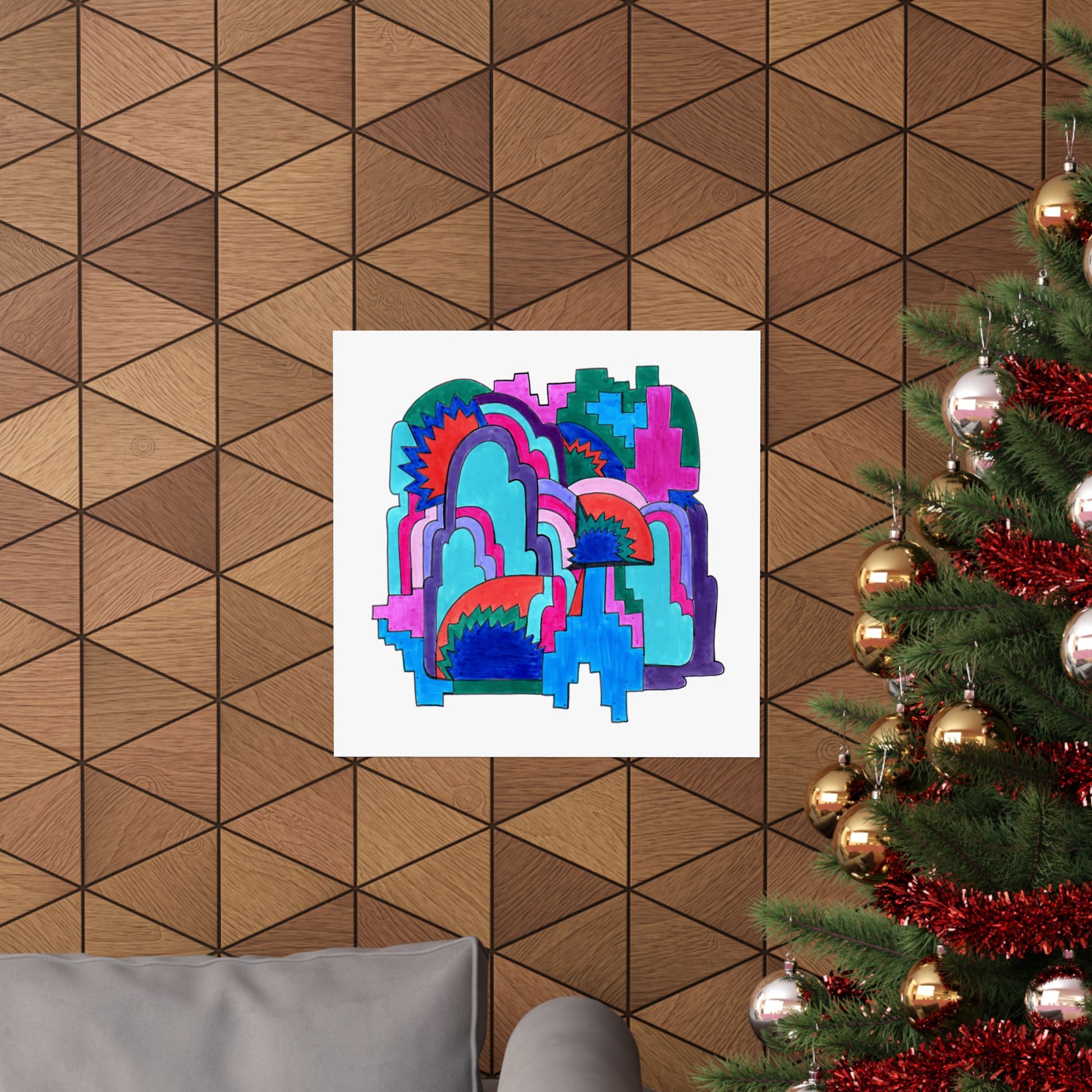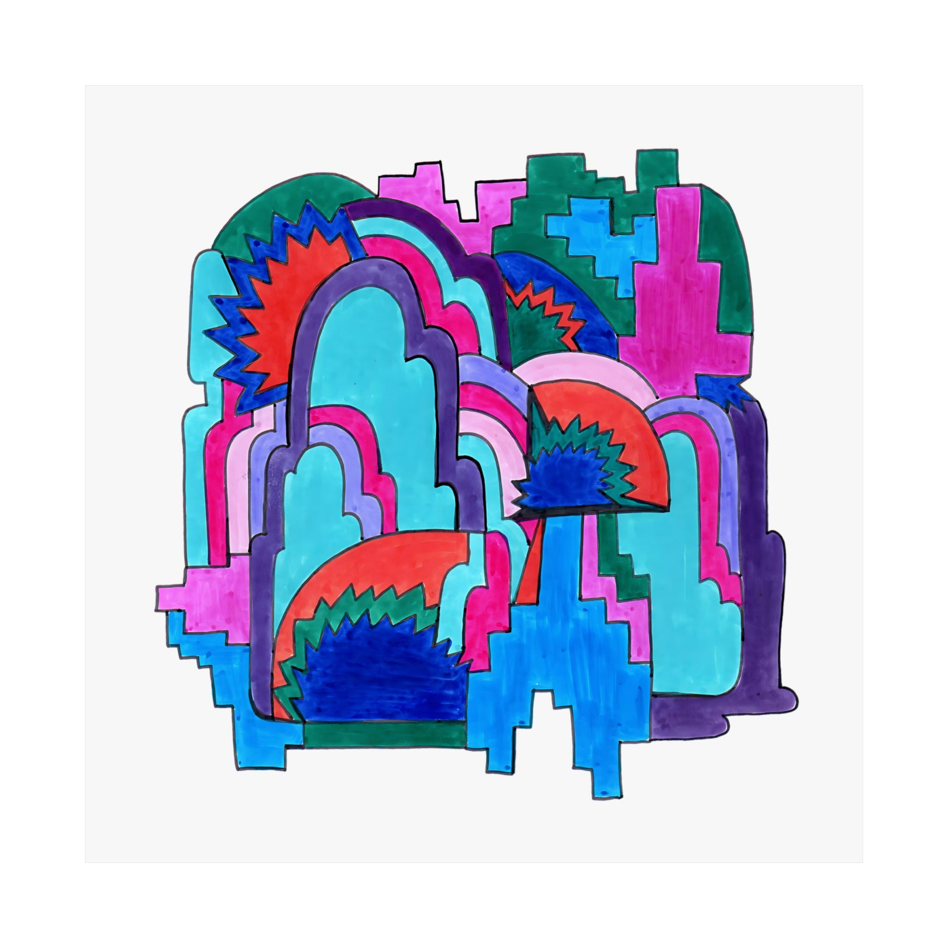 Layered arches build like weather patterns of thought—vivid, intricate, ever-shifting. Cloud Cover offers a landscape of saturated movement and mysterious topographies. Radiant bursts peek from behind softened forms, blending structure and sensation in a maximalist cascade of color and rhythm.