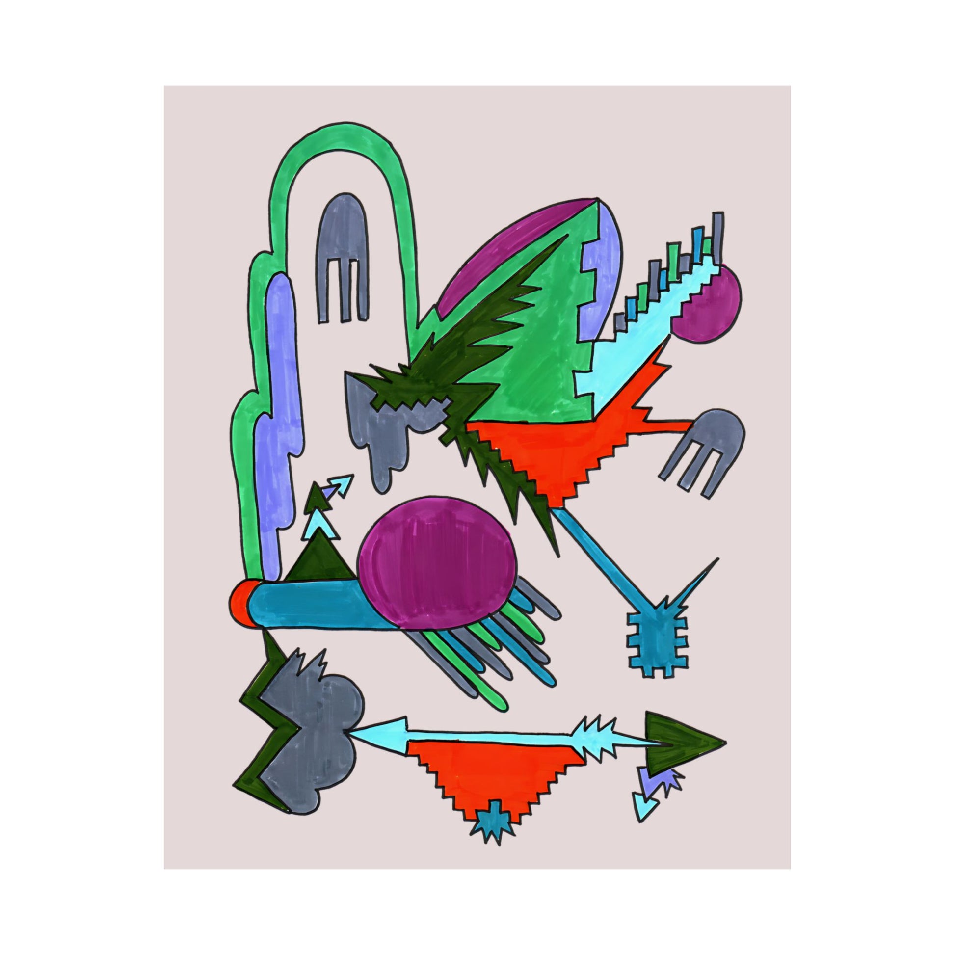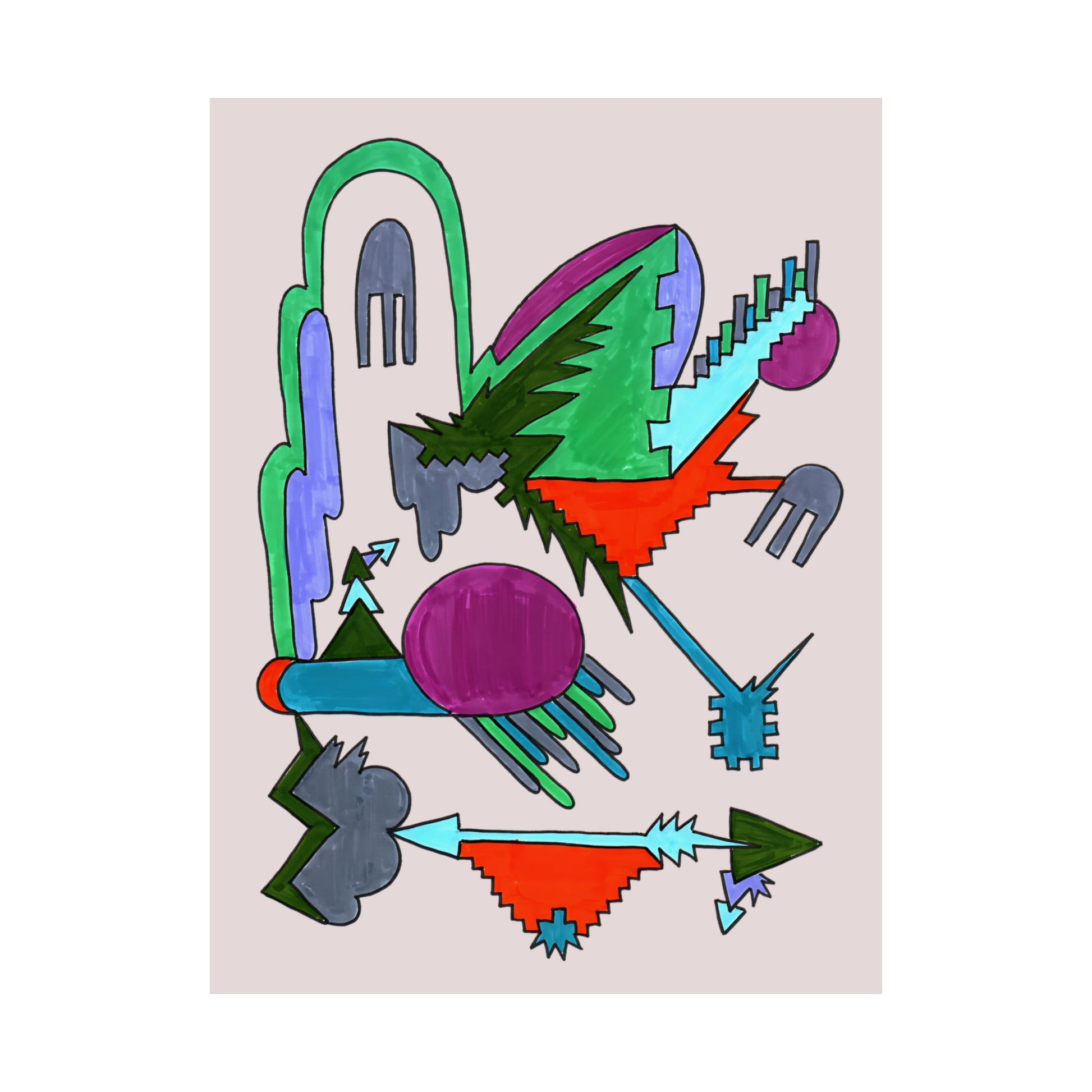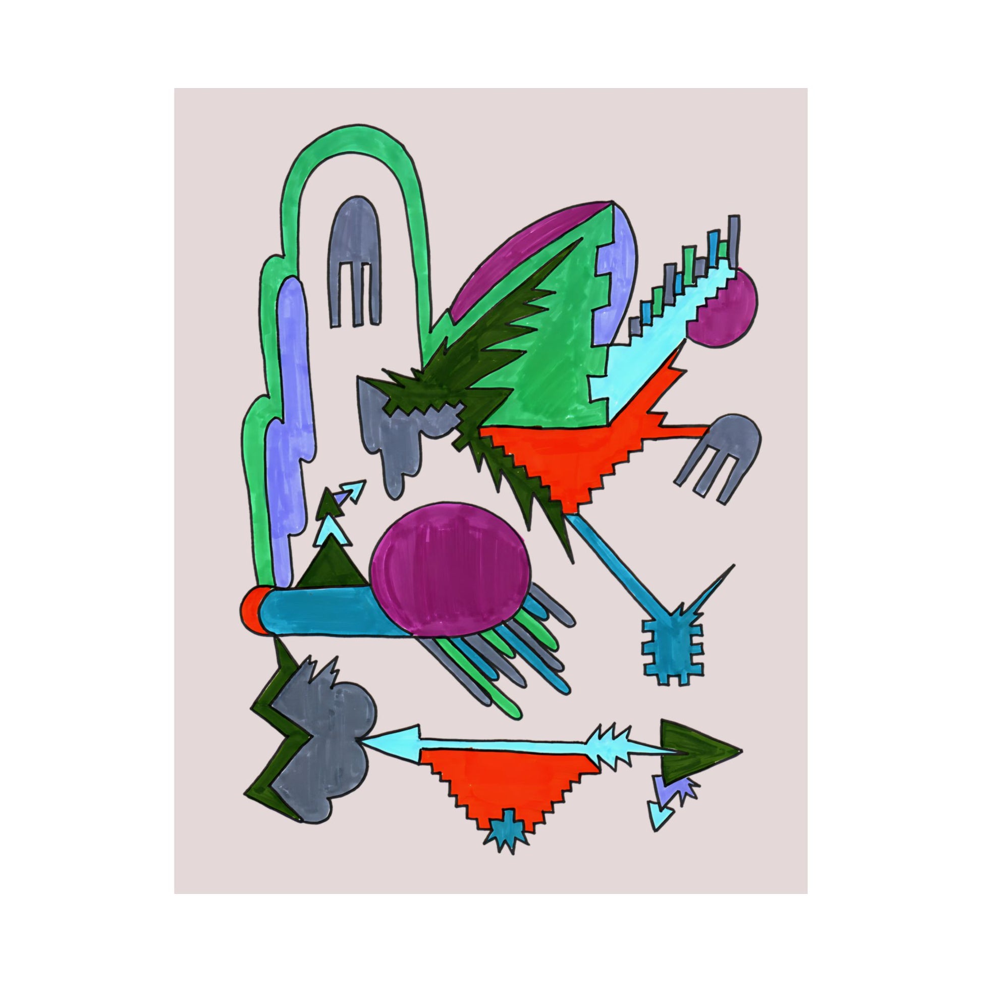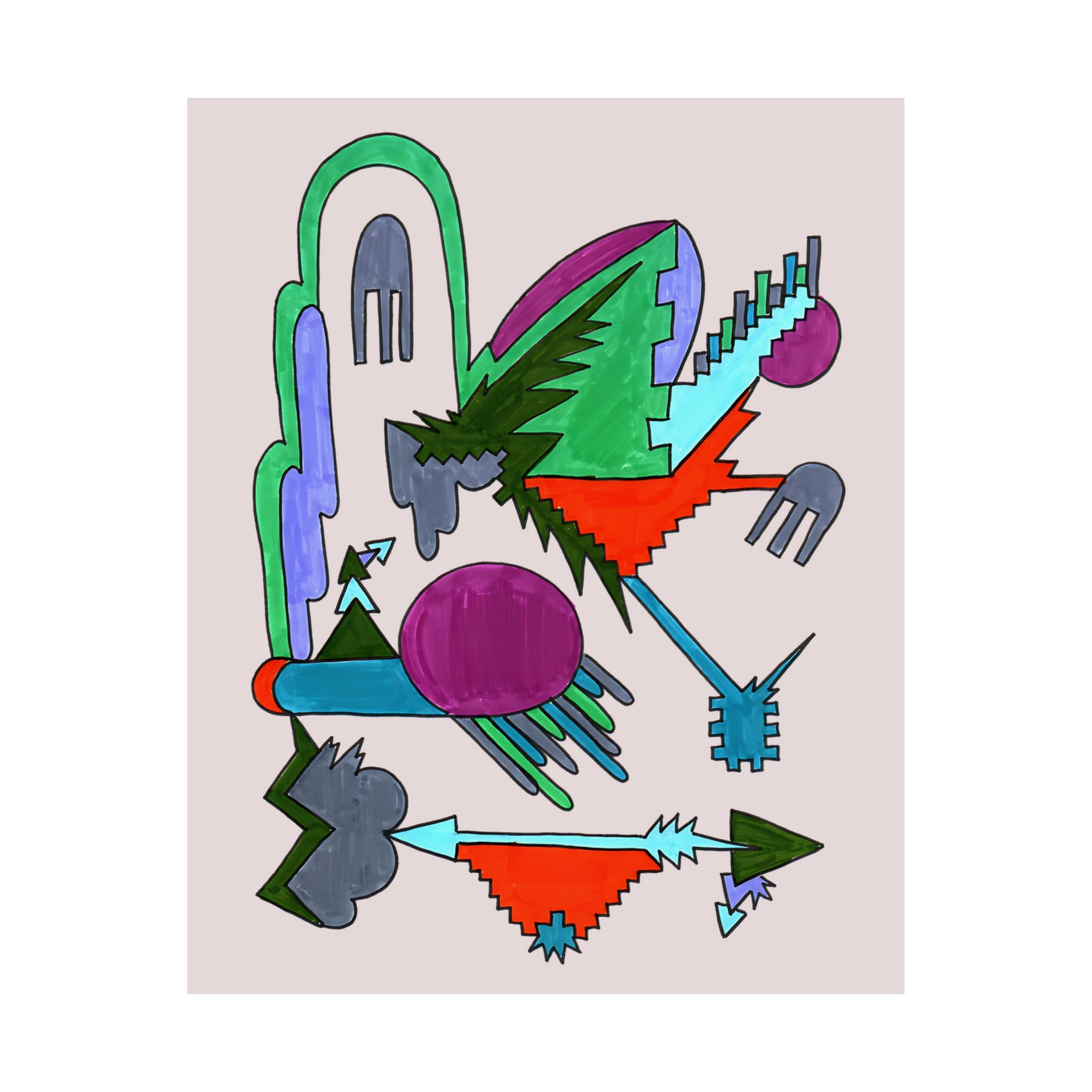 “Directional Code” is an original work on paper by Amy Blaschke, the founder of Mystic Quarterly, created using archival black ink liner and watercolor markers in an intuitive, improvisational process. The drawing explores constructed motion, symbolic geometry, and visual tension—reminiscent of postmodern abstraction, architectural draftsmanship, and spontaneous diagrammatic forms.