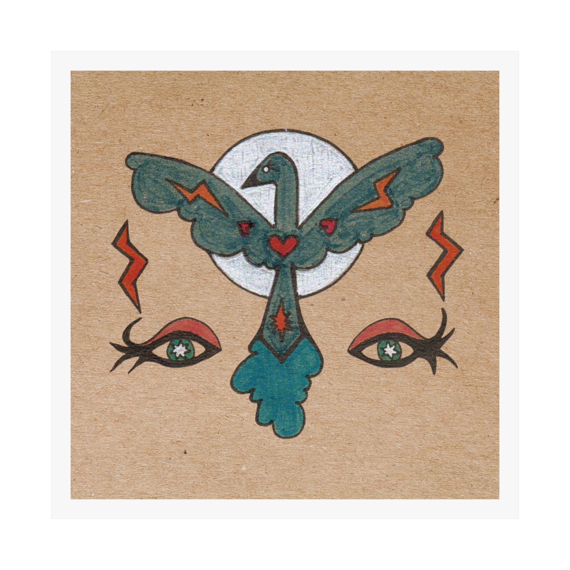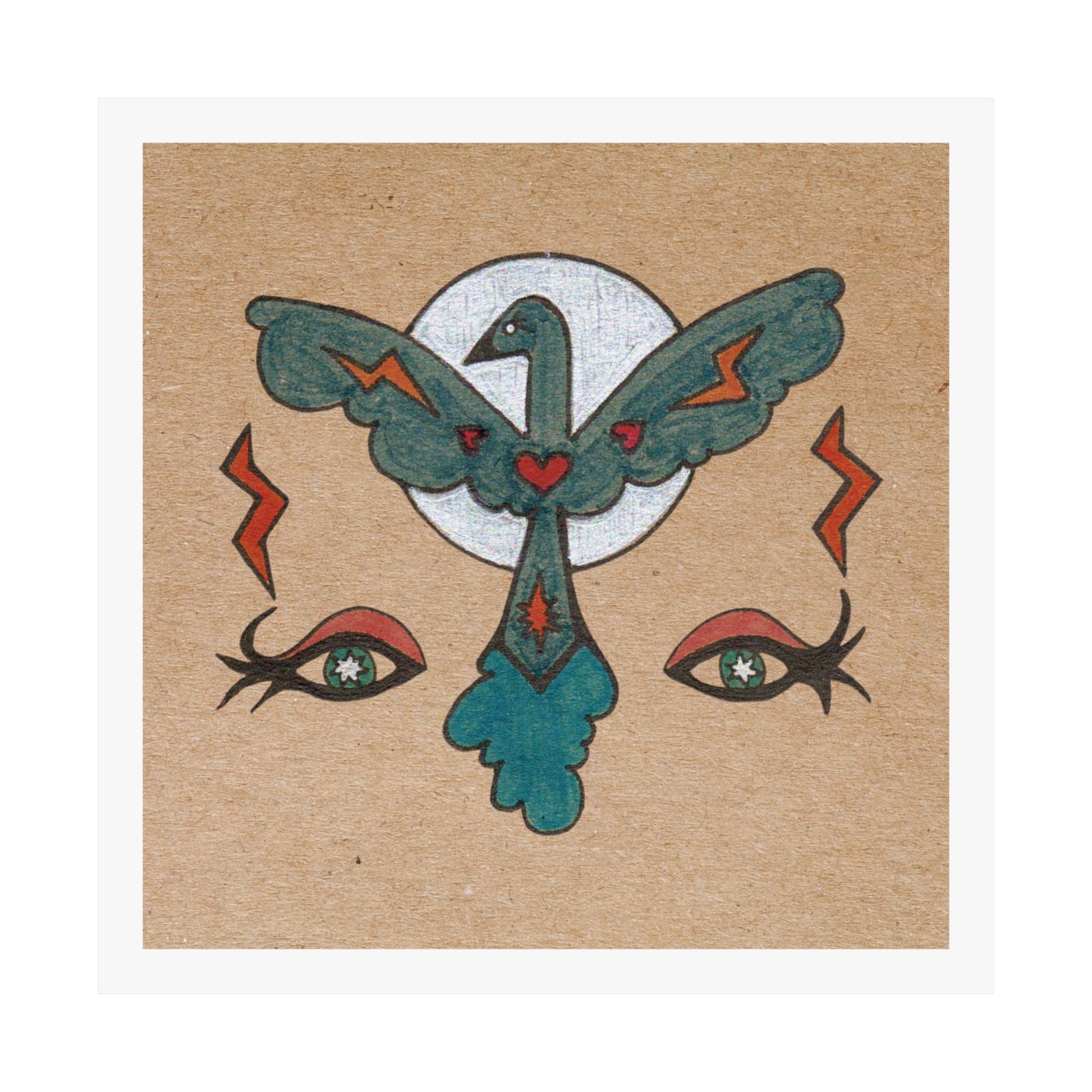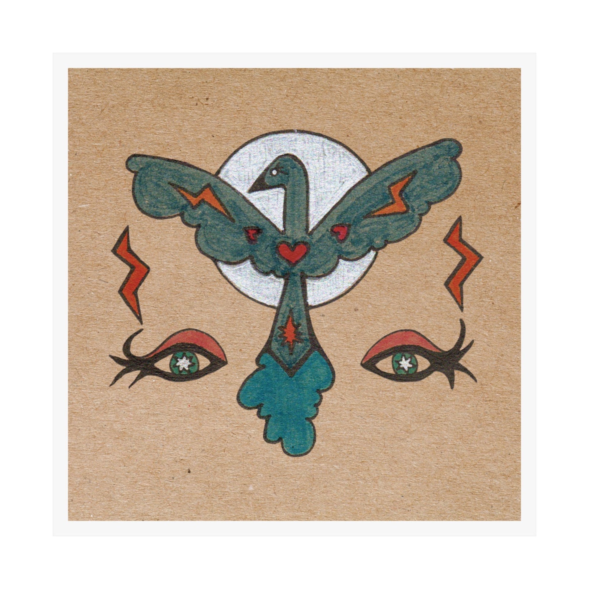 Feel to See is an emotional invocation rendered in ink and watercolor—blending fluid linework with layered lunar symbolism. A blue bird with a radiant heart transcends through a soulful silver moon, with all-seeing eyes below pierced by lightning. This work invites the viewer into the vulnerable intelligence of feeling as a form of clarity, awakening into a powerful presence.