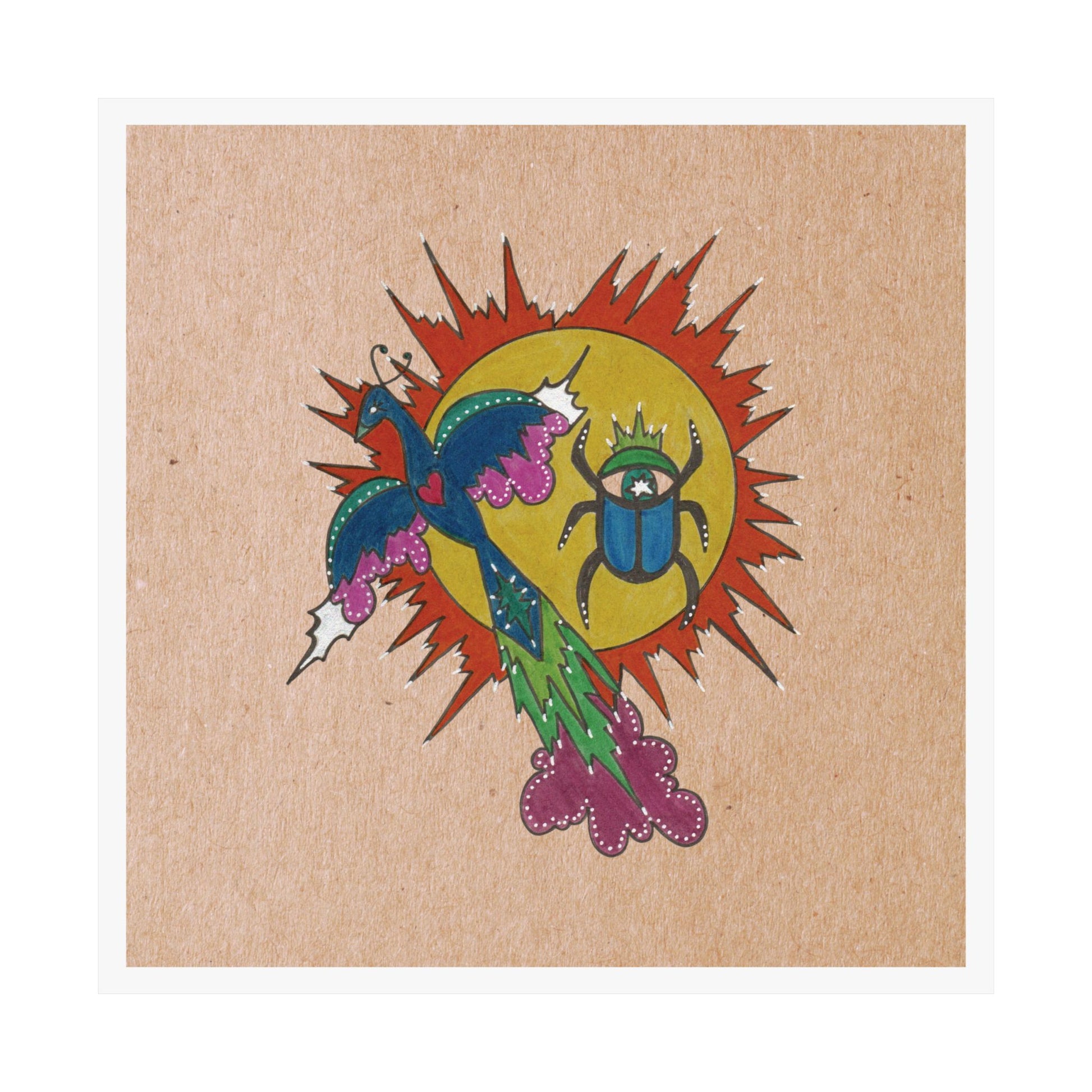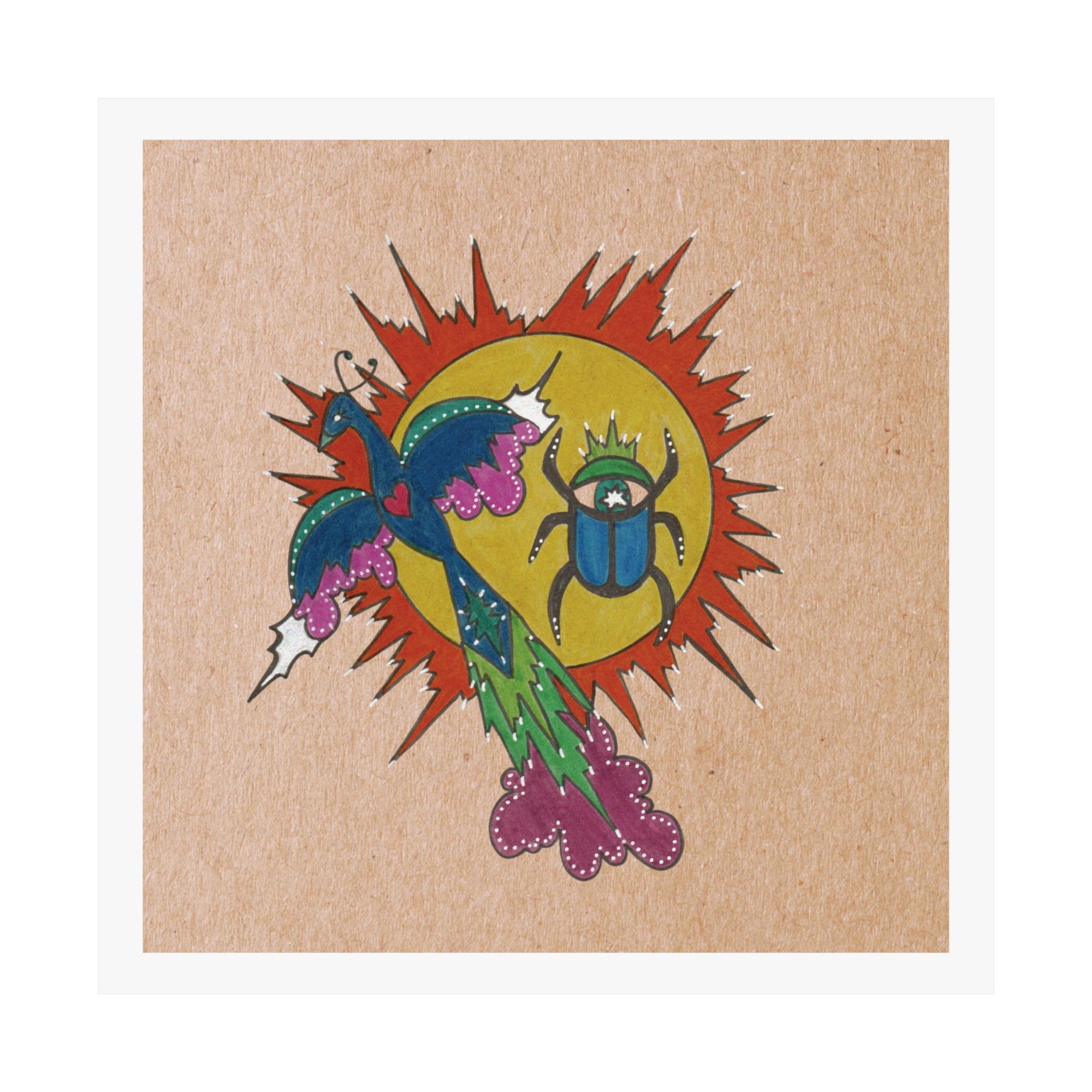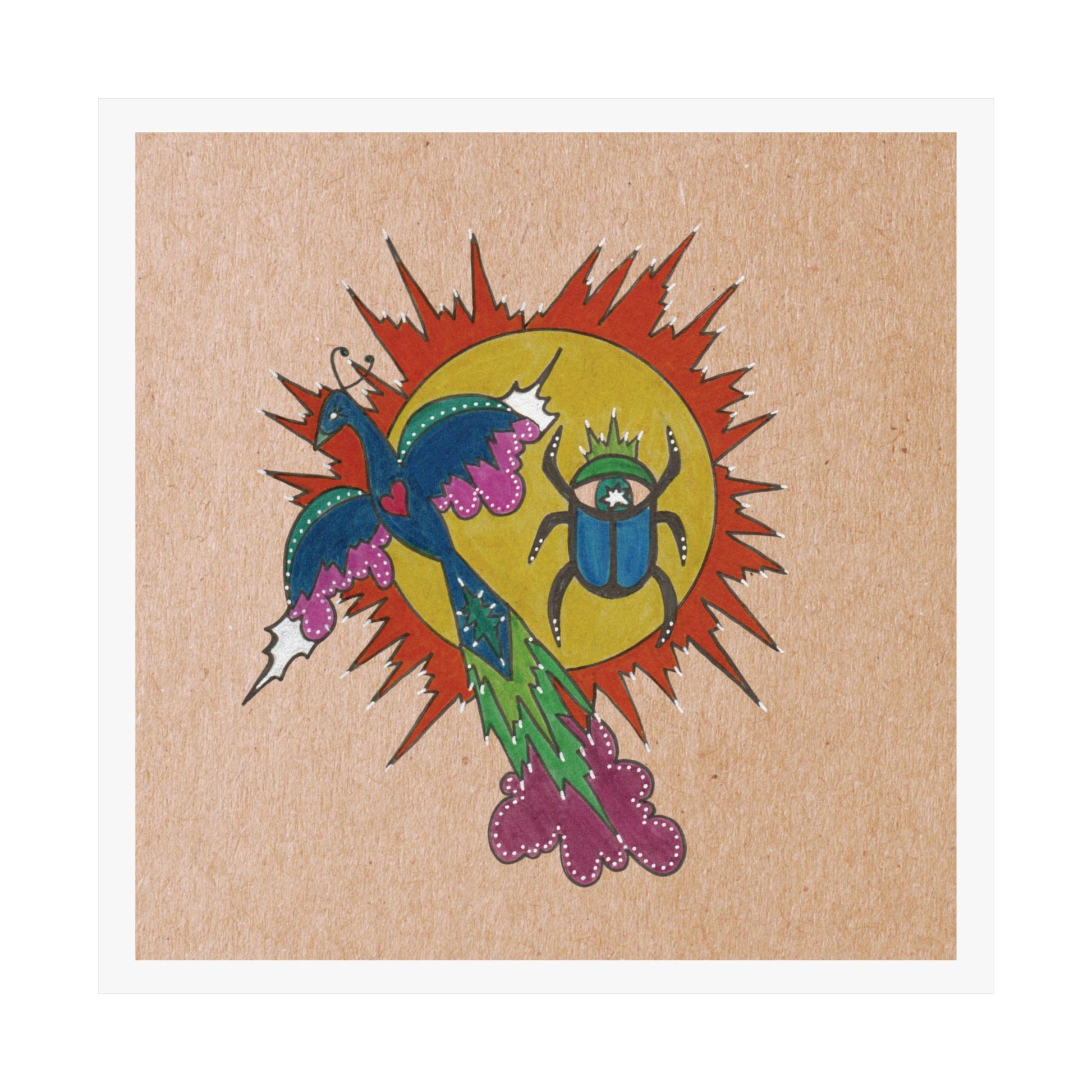 A solar scarab rises through a field of cosmic geometry, watched over by the peacock of pride transmuted into presence. This piece speaks to the timeless process of alchemical integration: when what’s been hidden or wounded becomes the very source of radiance.