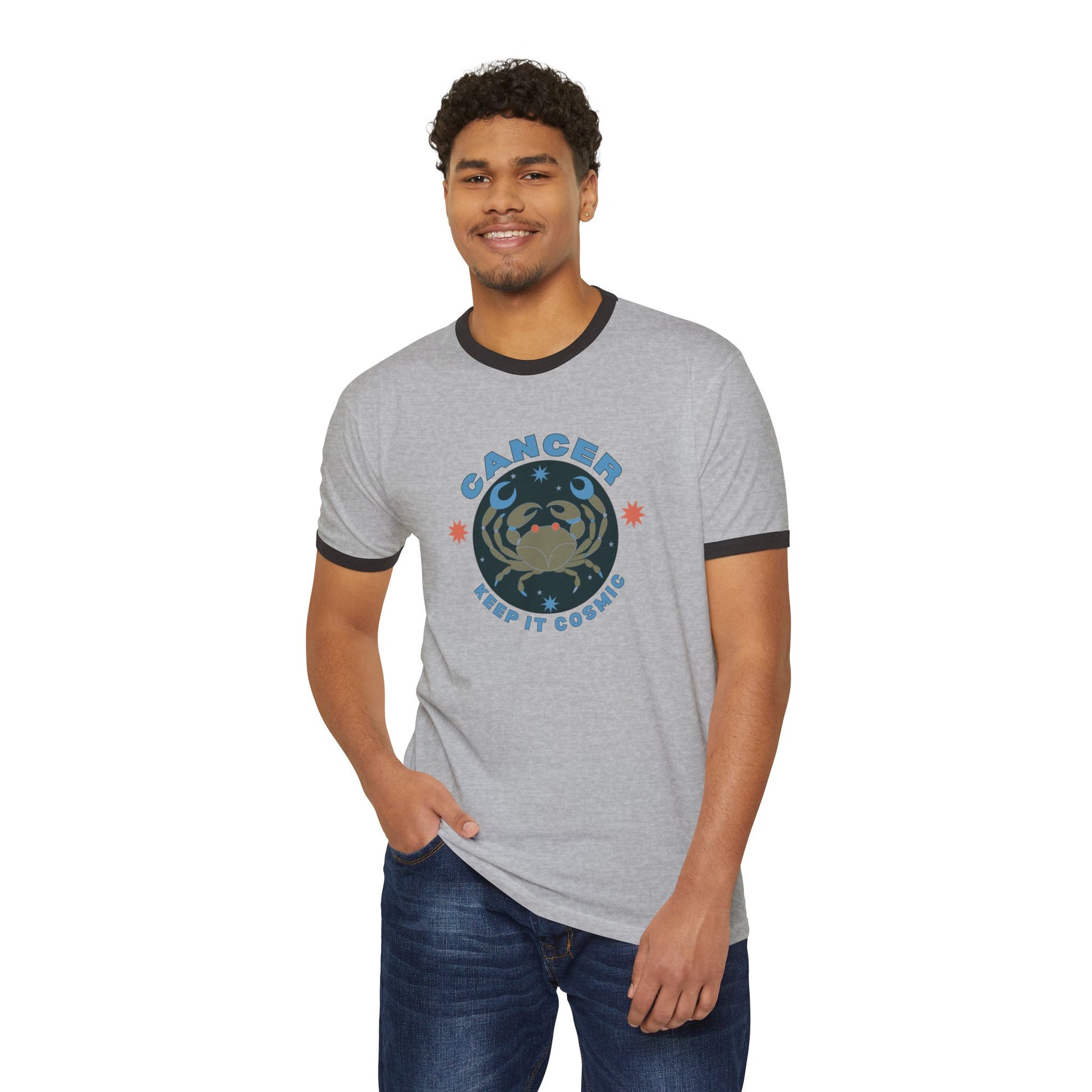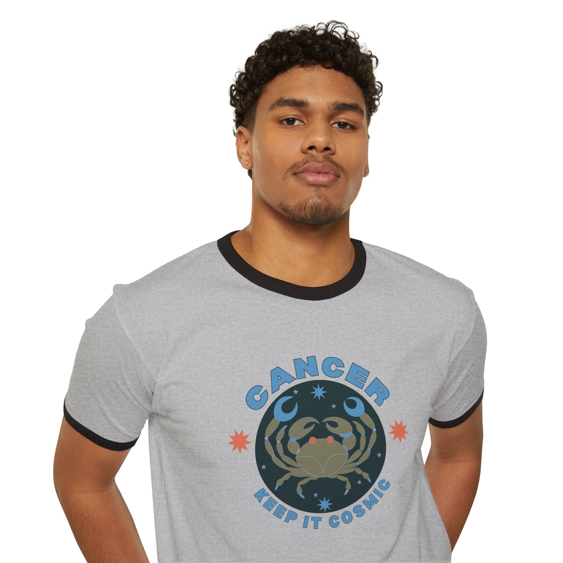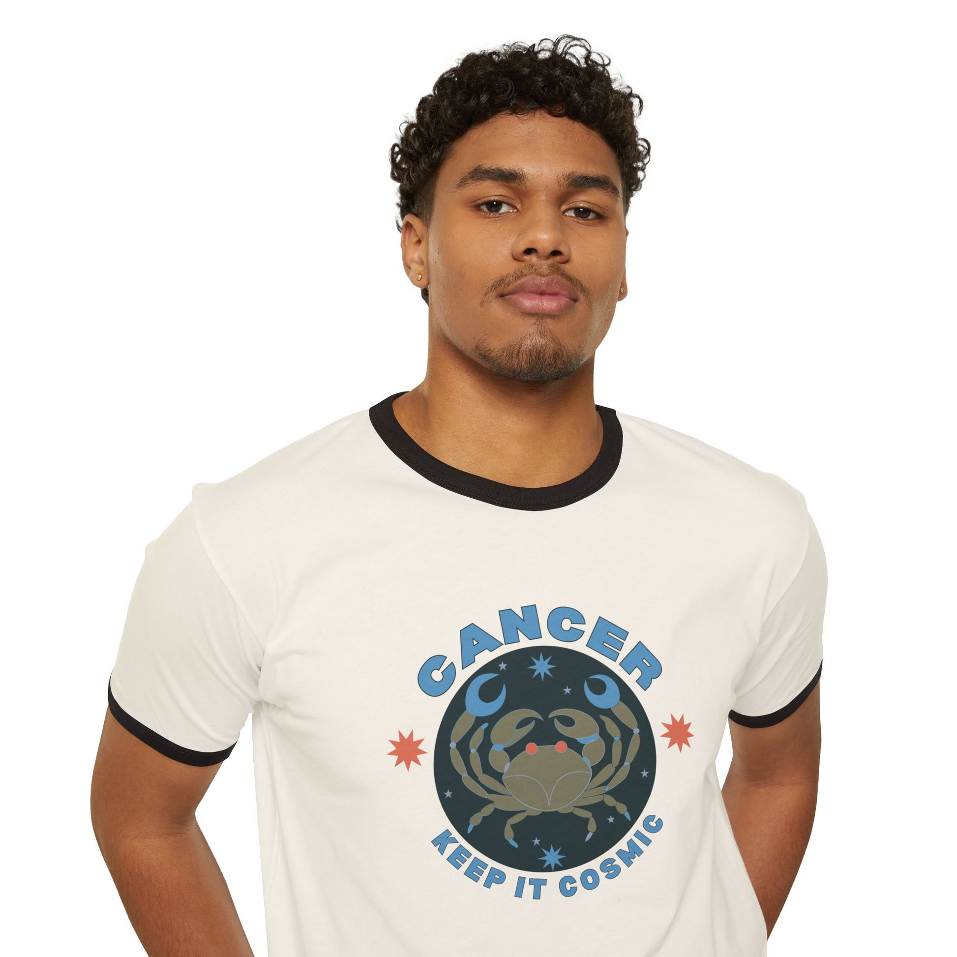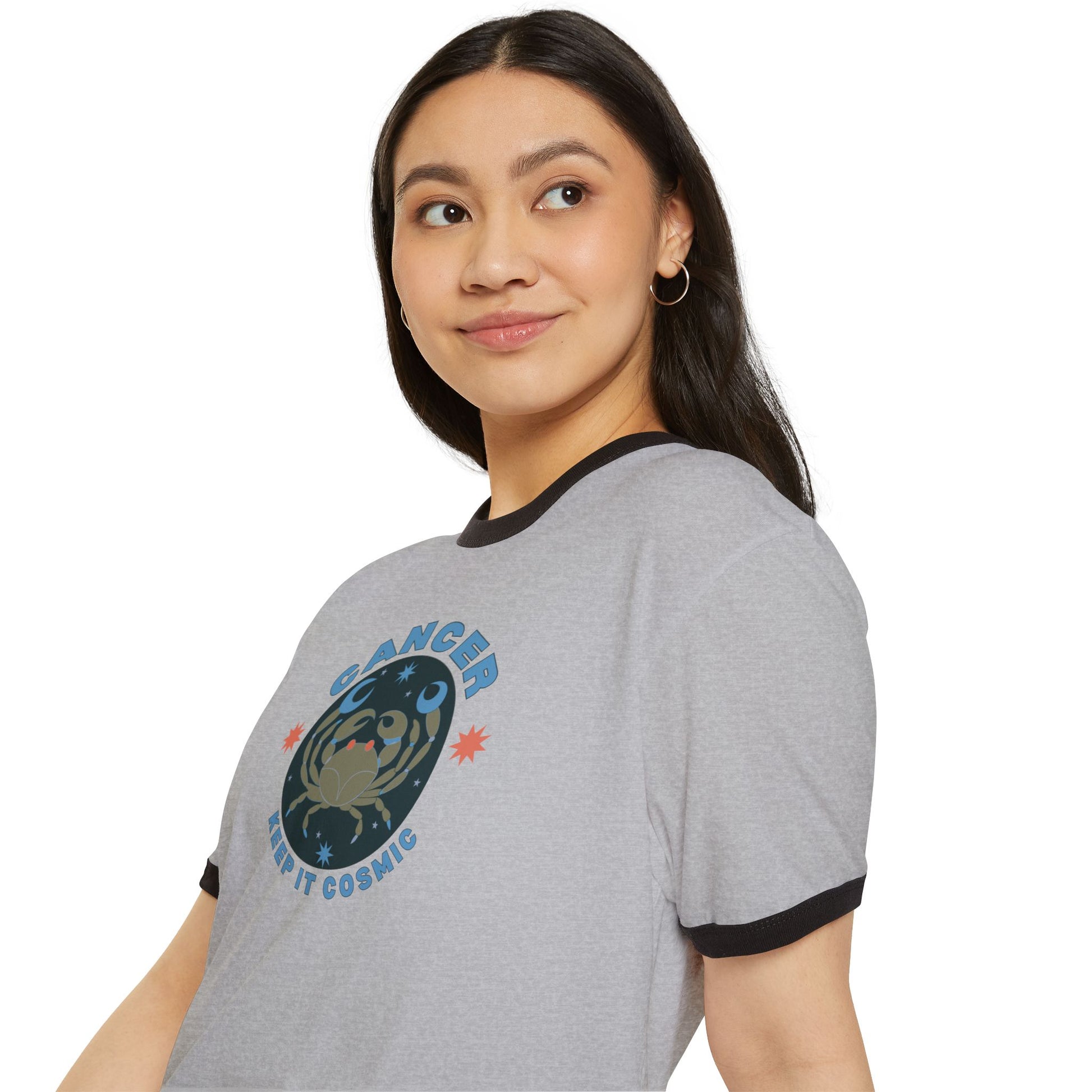 Bold, playful, and unmistakably cosmic—this retro-style Cancer ringer tee is part of the Keep it Cosmic zodiac series, blending 70s-inspired design with astrological flair.