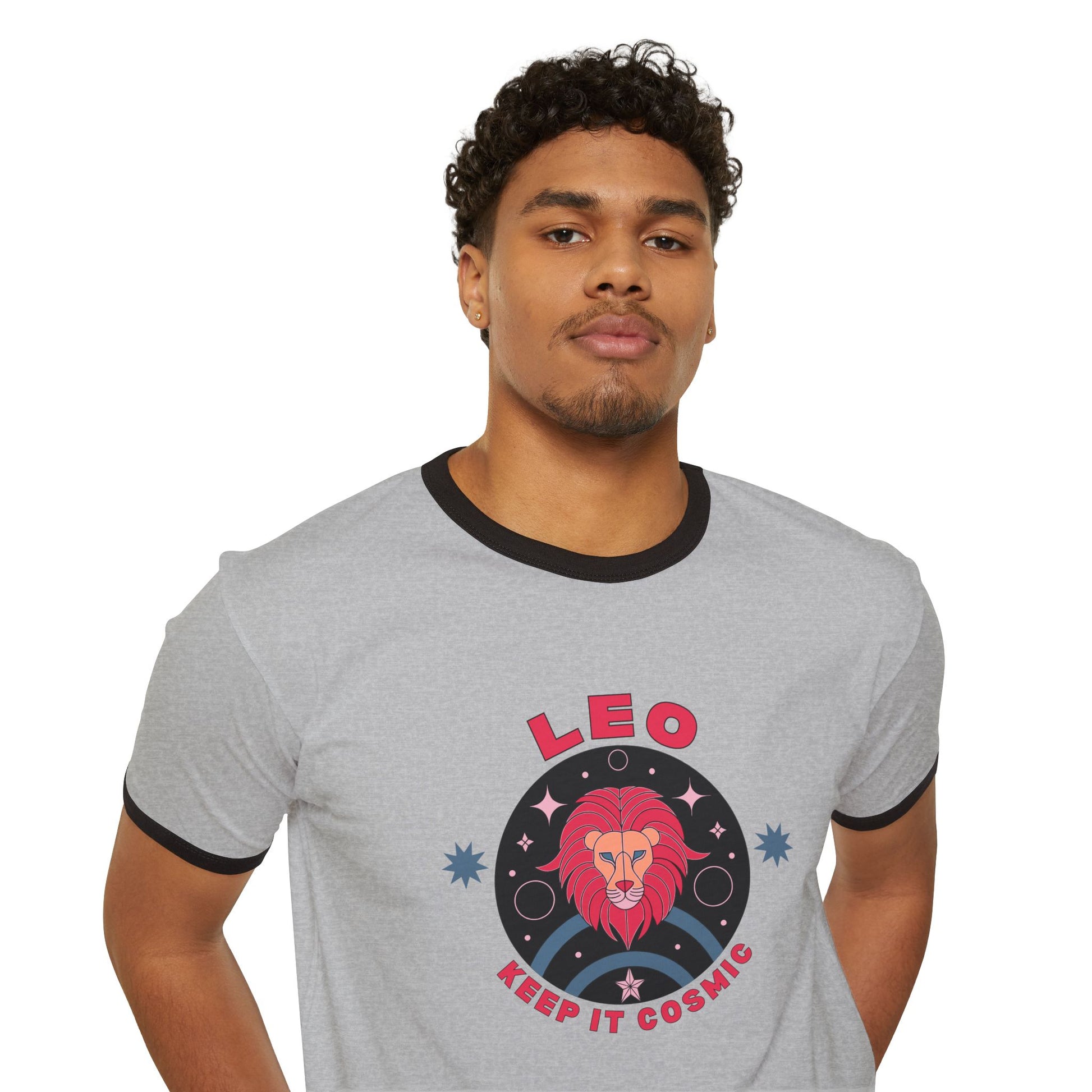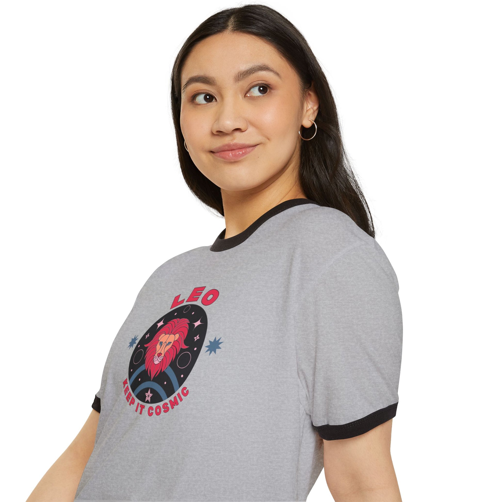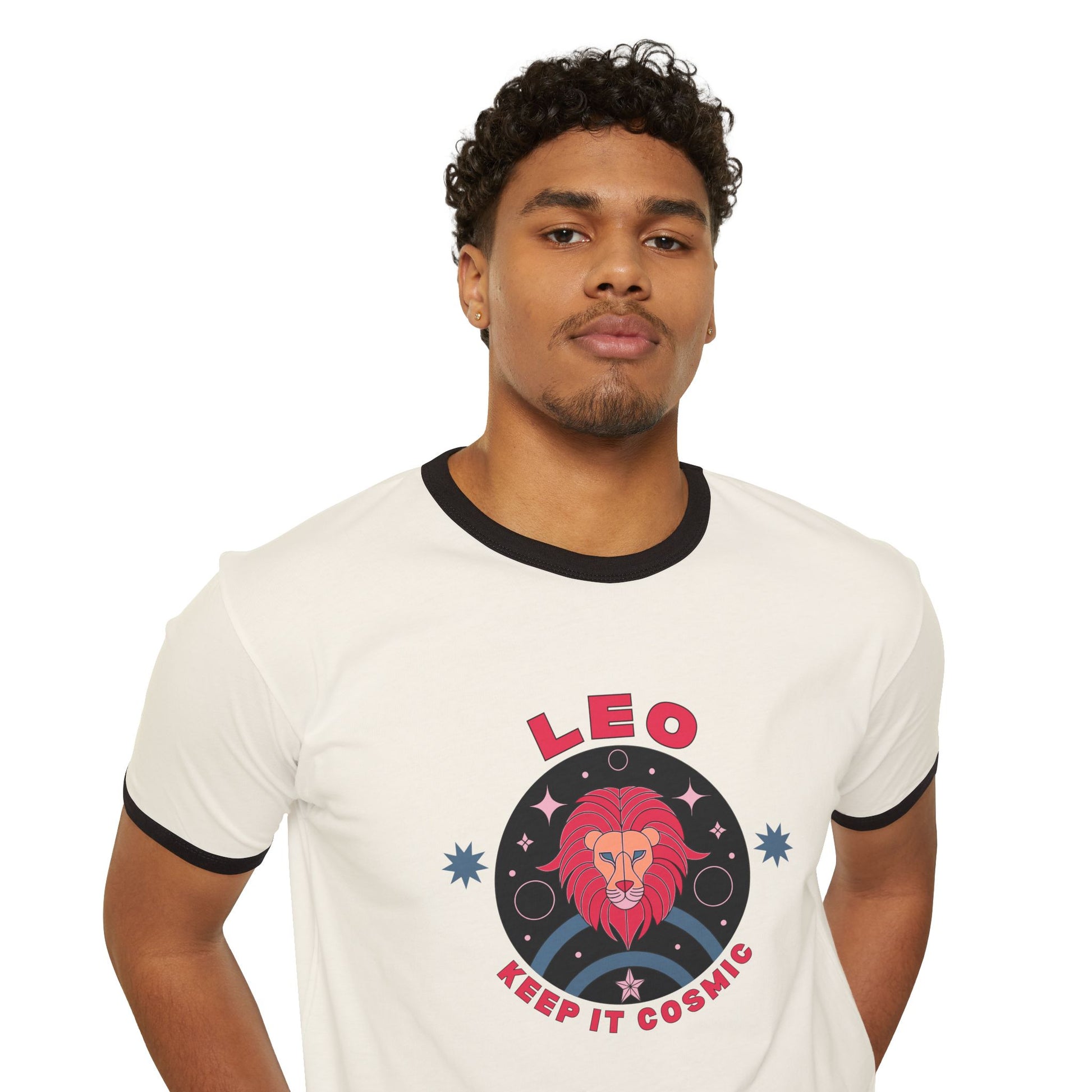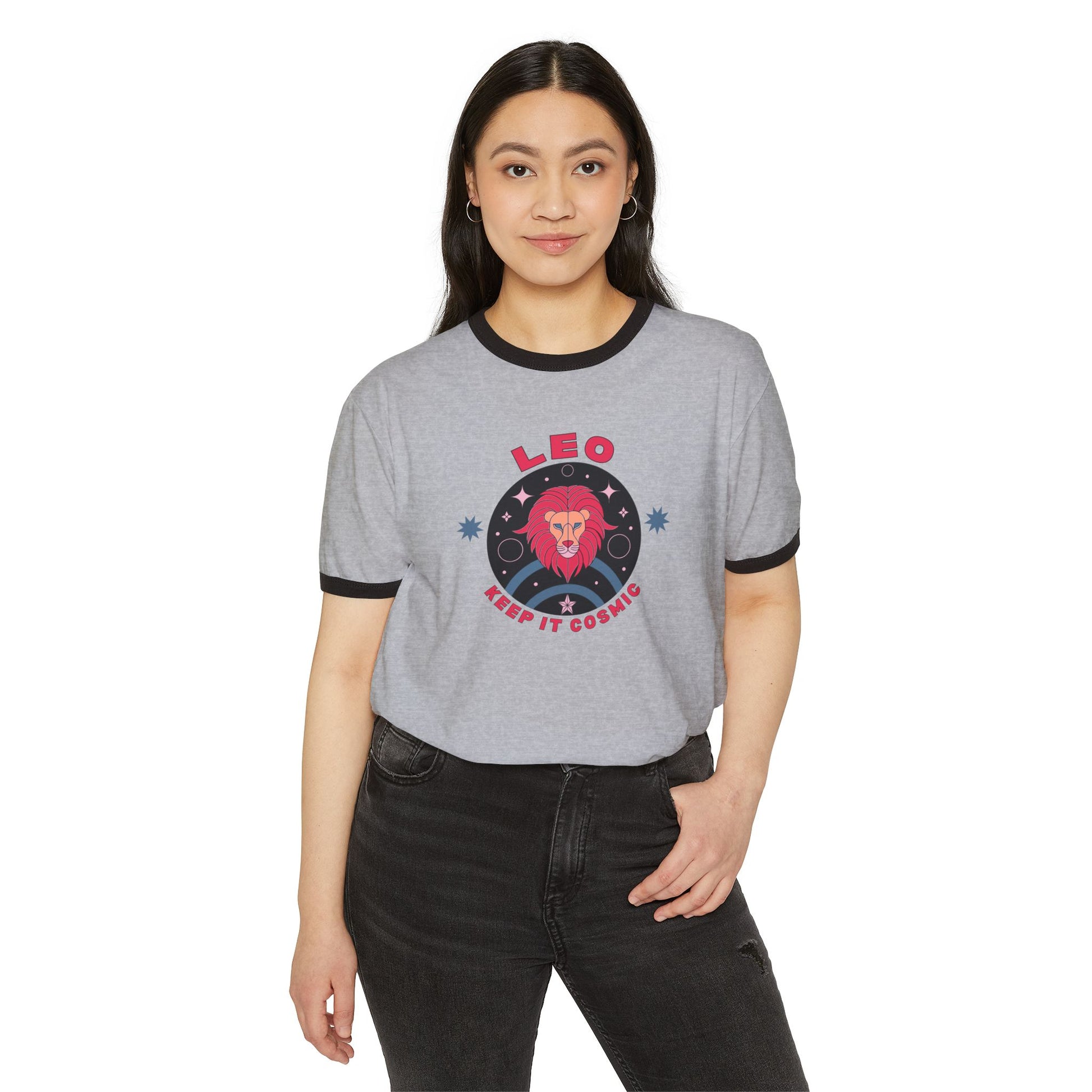 Bold, playful, and unmistakably cosmic—this retro-style Leo ringer tee is part of the Keep it Cosmic zodiac series, blending 70s-inspired design with astrological flair.