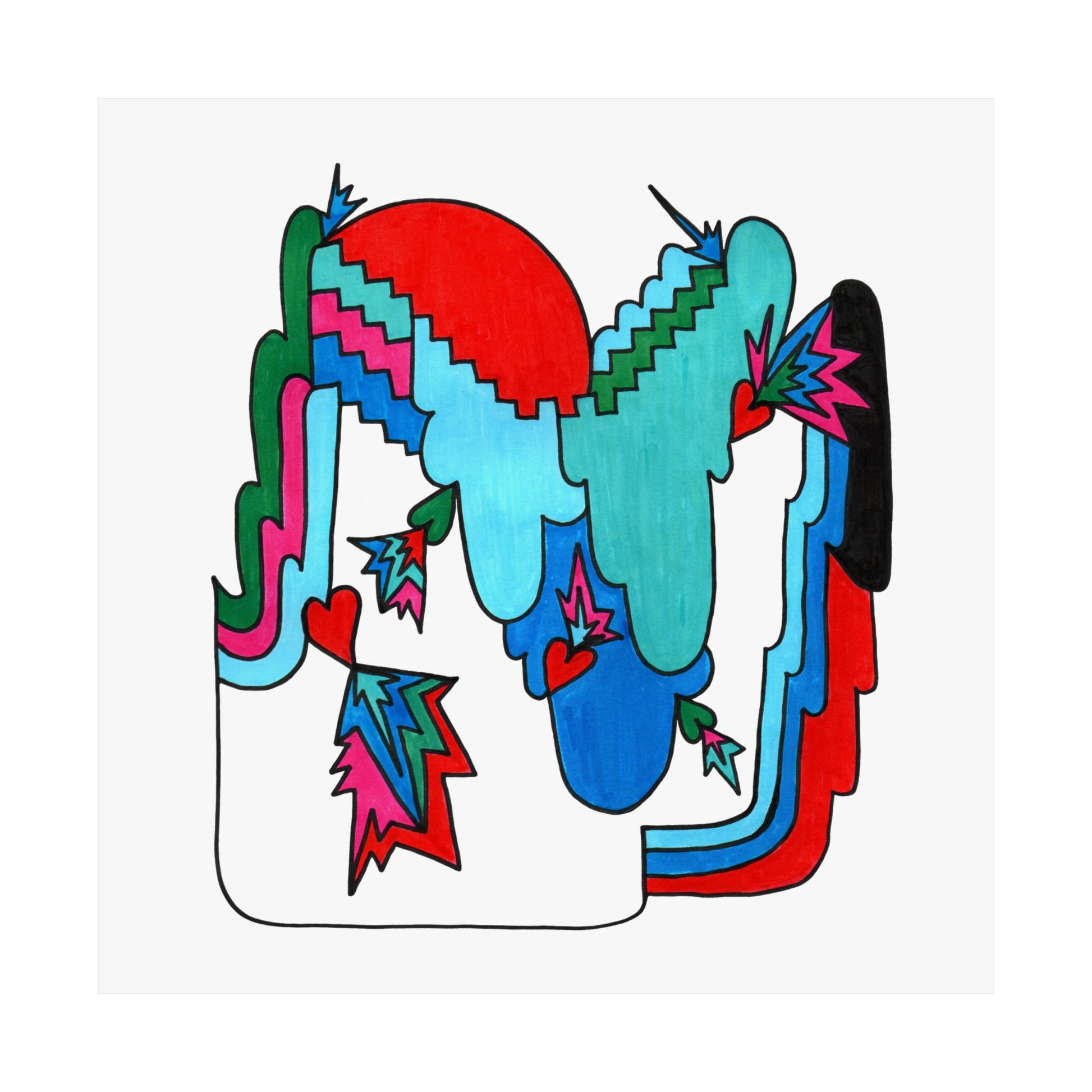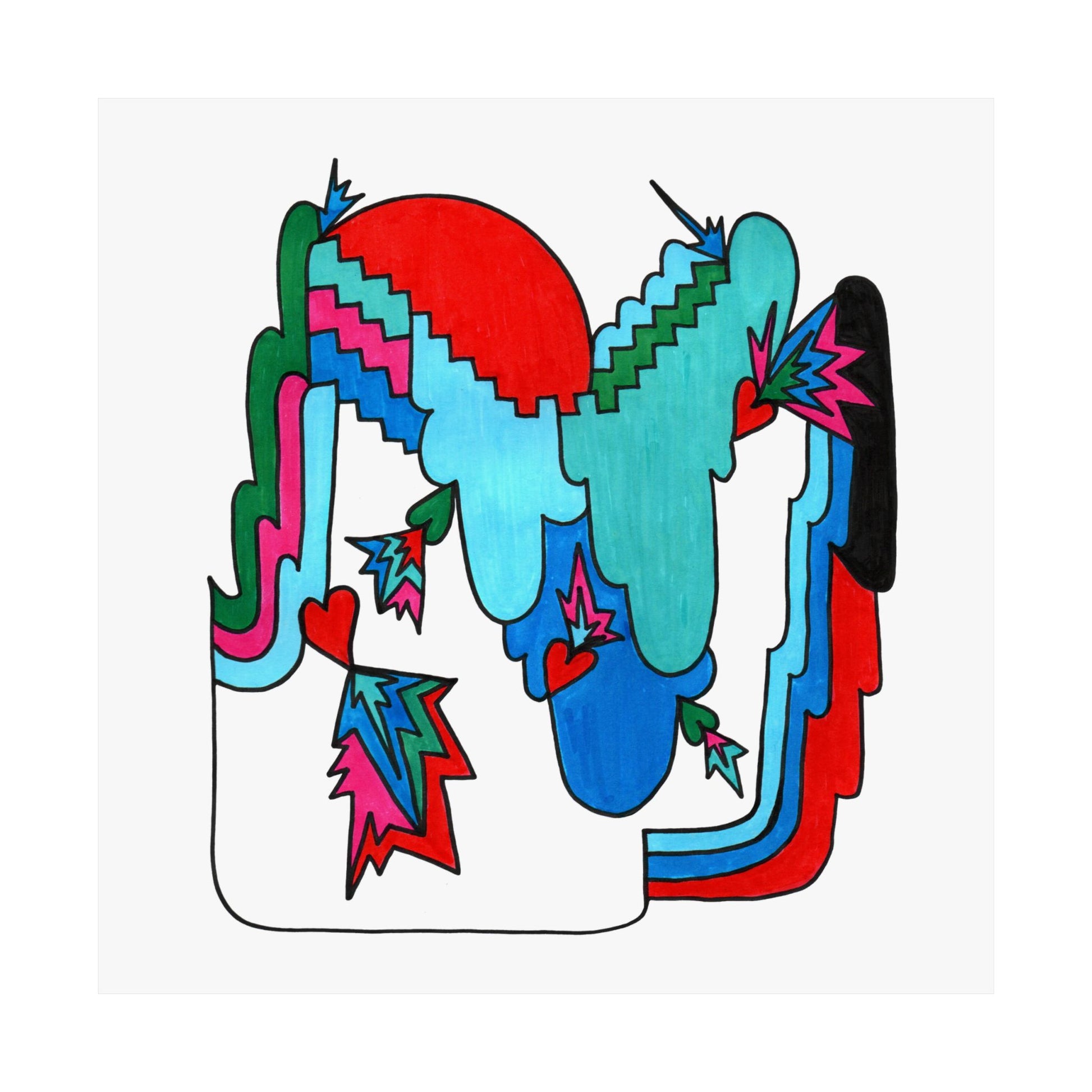 Hand drawn by Amy Blaschke with black ink liner and watercolor marker, Open Heart Circuit is a visual waveform of release and re-patterning.