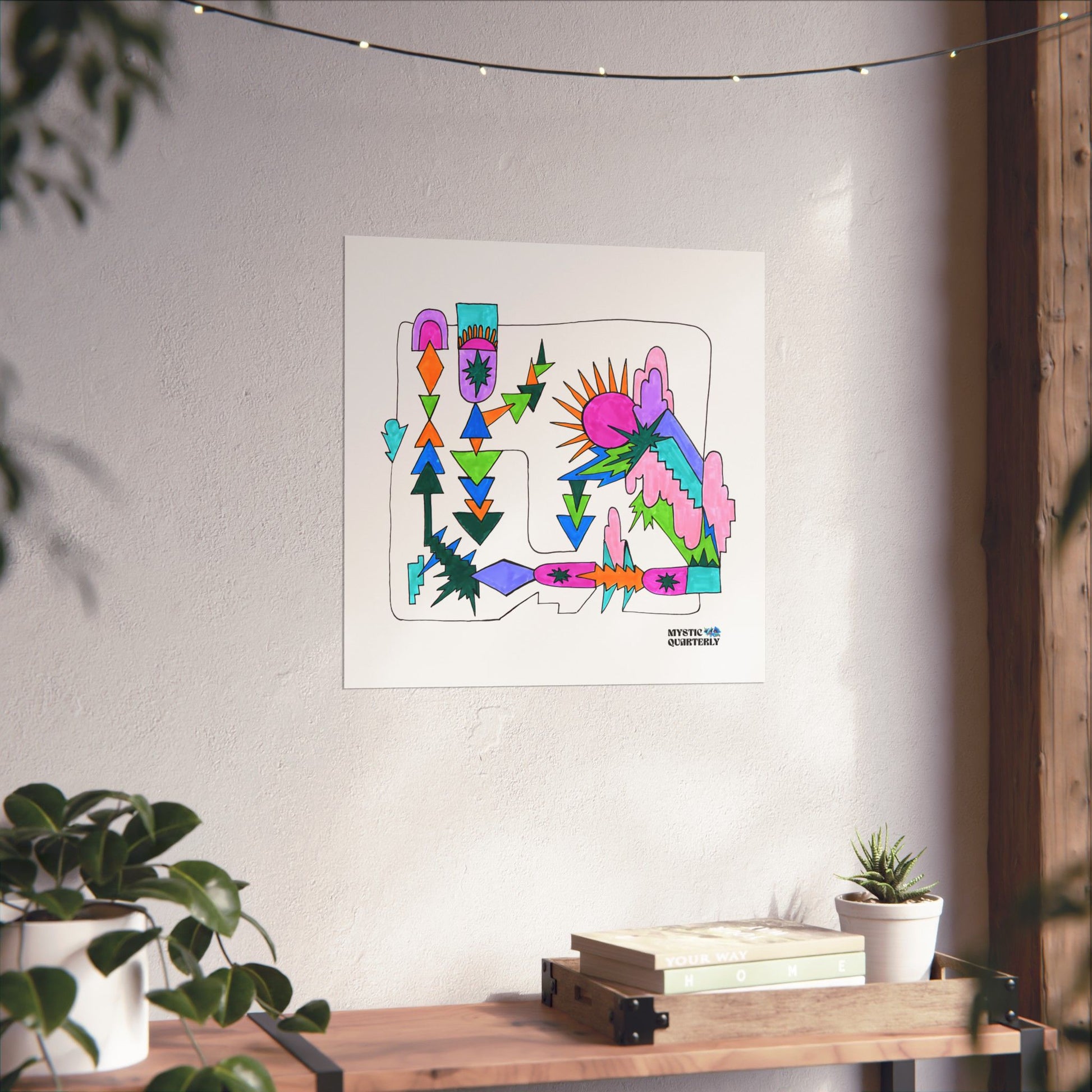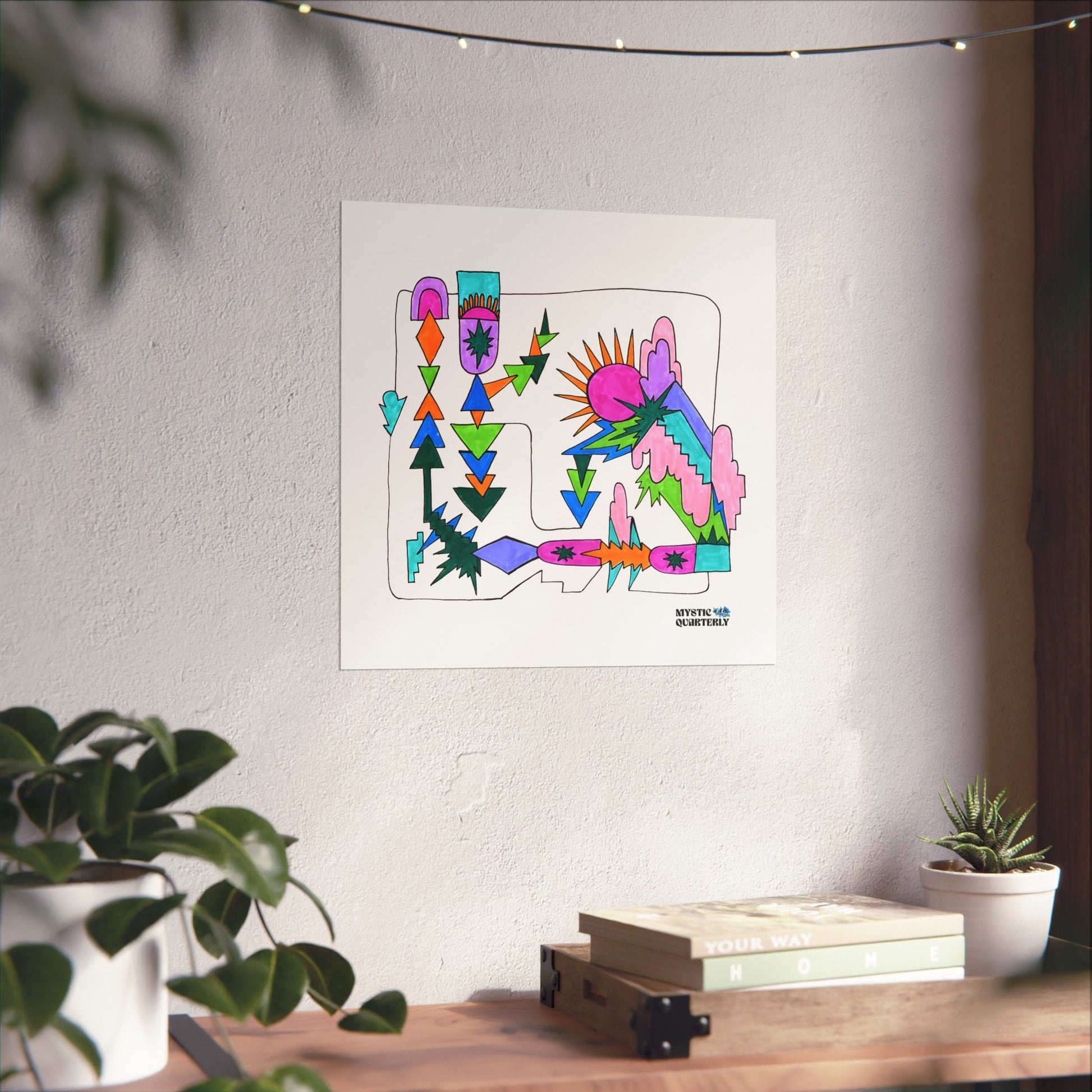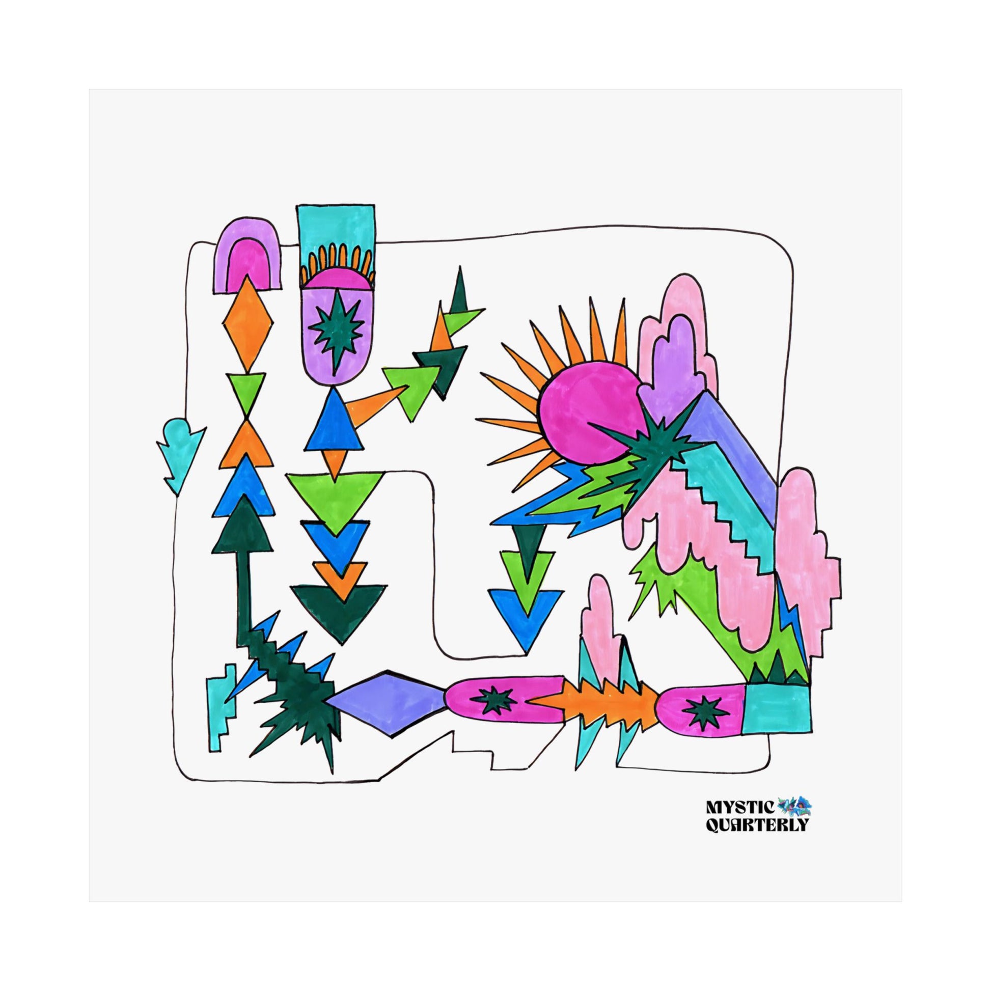 Arrows flow in layered succession—each pointing toward some unseen inner directive. Through bursts of pink, green, and cobalt, this piece translates the language of will, wonder, and wayfinding.