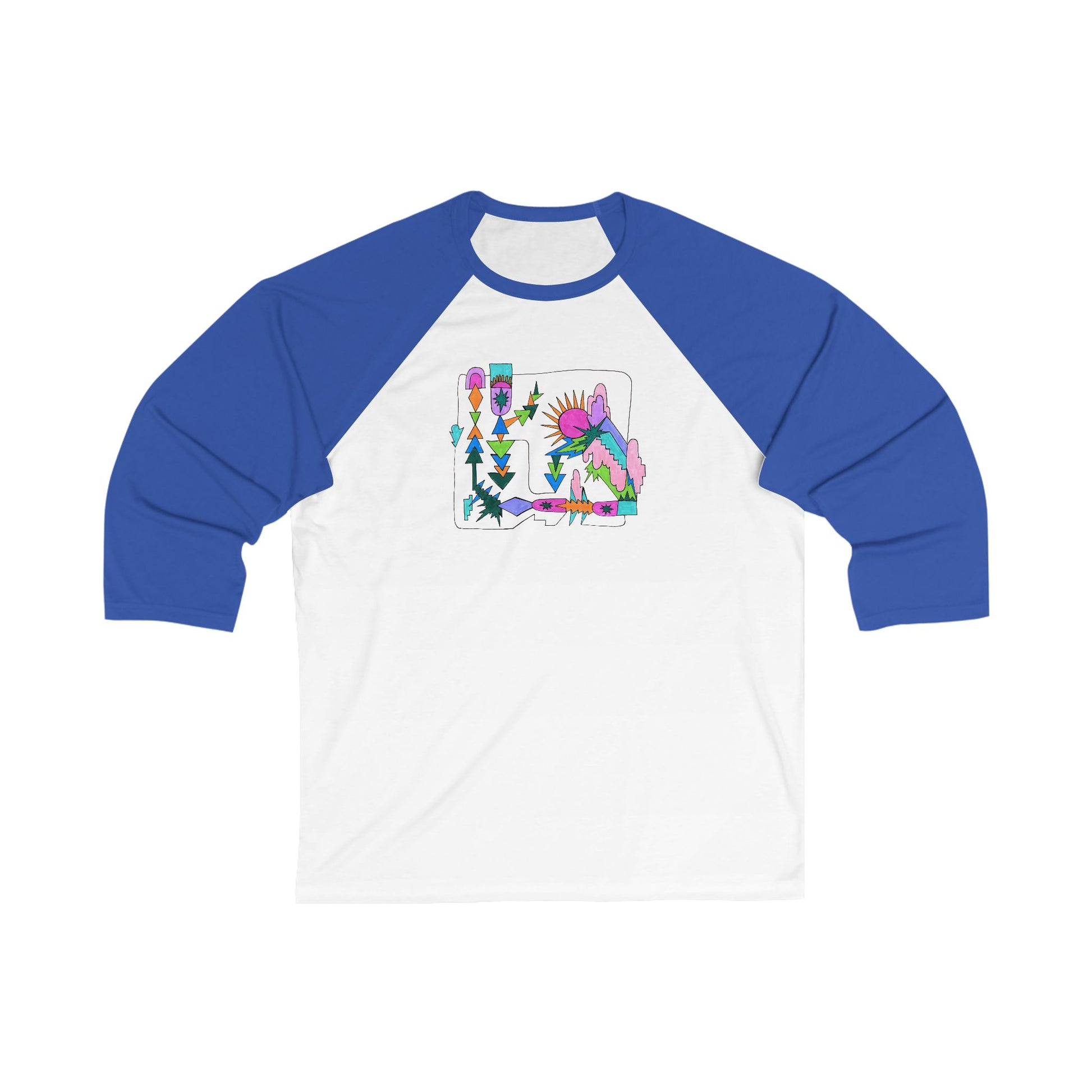 The 3/4 sleeve baseball tee frames the artwork like a gallery piece, built with lightweight fabric and a modern fit—perfect for day-to-night orbit.